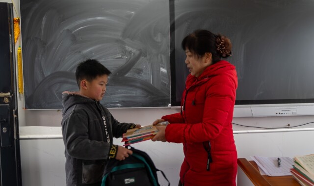(三年级班主任卞月兰给前来报到的胡智翔同学新学期课本,激励他新学期好好学习、更加努力。湖南日报全媒体记者 童臻熙 摄)