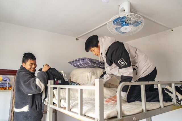 (寄宿的同学正在宿舍铺床。湖南日报全媒体记者 童臻熙 摄)