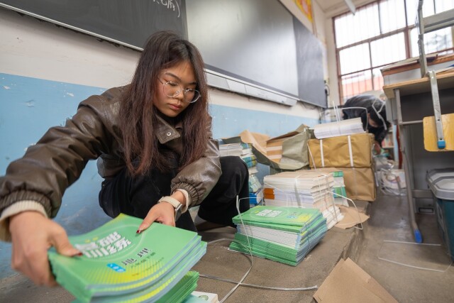 (八年级教室里,老师正在给同学们分发新学期课本。湖南日报全媒体记者 童臻熙 摄)