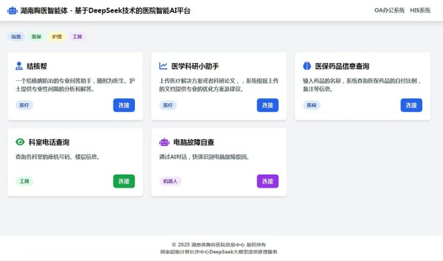 目前,湖南省胸科医院探索落地的DeepSeek大模型,可应用于辅助外科无管化临床手术路径制订、结核病感染风险自测评估、病历质控管理、以及病历等医疗文书的生成等多个医疗场景中,对医务人员的多轮问询给出反馈,并进一步提供更为全面完善的治疗方案。同时,采用智能体编排工具开发了结核帮、医学科研小助手、医保药品信息查询、科室电话查询、电脑故障自查等多个智能体应用。