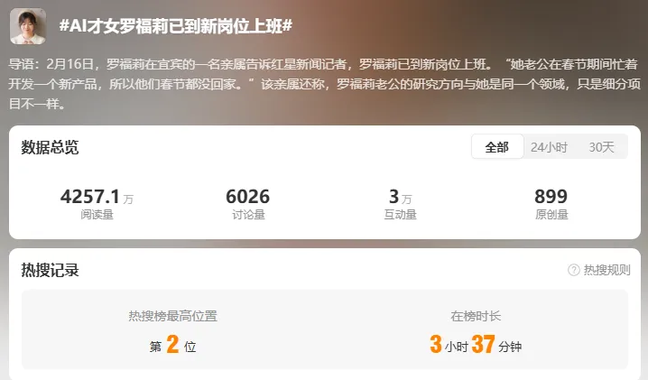 随后,话题“AI才女罗福莉已到新岗位上班”登上热搜。