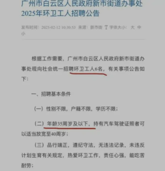 近日,广州市白云区新市街道办事处发布招聘公告,向社会统一招聘环卫工人6名,其中要求“年龄35周岁及以下,持有汽车驾驶证照者可以适当放宽至40周岁”。
