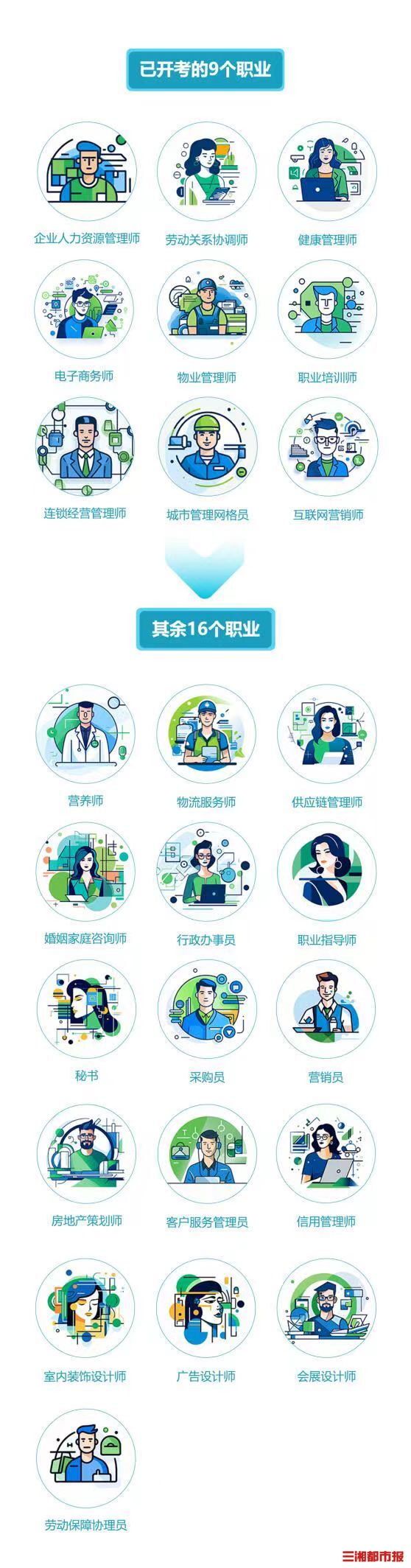 记者了解到,纳入全省统一认定范围的职业(工种)有25个,按照“成熟一个,实施一个”的原则,分批纳入2025年3、5、7、9、11月的统考计划。企业人力资源管理师、健康管理师、劳动关系协调师、电子商务师(网商、跨境电子商务师)、物业管理师、职业培训师、连锁经营管理师、城市管理网格员、互联网营销师(直播销售员)等9个职业(工种)将于3月9日在全省范围内统一开考。