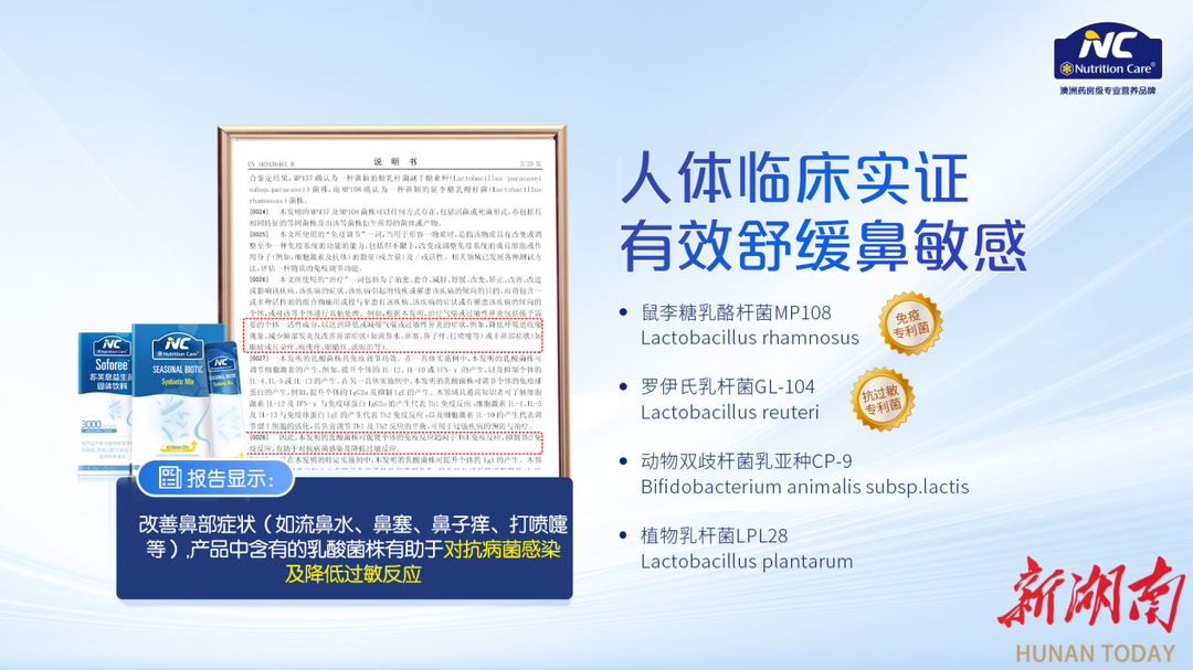 在此背景下,NC围绕消费者需求,重磅打造NC舒鼻益生菌系列产品。该产品凭借两大独创性优势,开创了以益生菌应对过敏性鼻炎的新纪元。在产品配方方面,NC舒鼻益生菌采用“全专利”菌株,从强免疫、抗过敏、护肠道等多方面改善过敏,且活菌量高达400亿/袋,不仅能减少鼻敏反复发作问题,还能通过调节免疫失衡从根源上改善过敏体质;在产品“有效性”验证方面,NC舒鼻益生菌早在上市之前,就经由澳洲顶尖医疗中心NIIM开展临床试验,试验结果表明:连续服用NC舒鼻益生菌12周后,患者鼻塞、流涕等症状显著缓解,产品有效性得到有力验证。