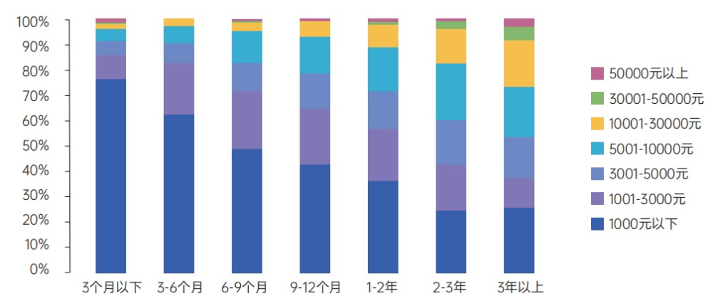 这表明,随着经验的积累,探店达人能够获得更好的收入,而且职业发展具有正向的增长潜力。长时间的内容积累有助于达人形成具备吸引力的个人品牌,吸引稳定的粉丝群体,提升价值共创能力。丰富的探店经验还使达人更了解市场和商家需求,制作出更优质的内容,进一步提升达人自身收入,探店达人的职业发展具有正向的增长潜力。