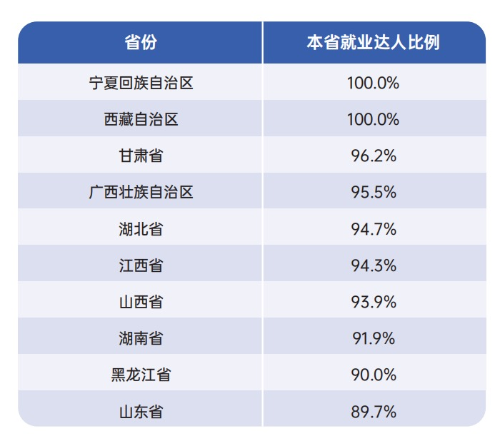 据报告统计,约80.1%的探店达人选择在本省就业,其中宁夏、西藏、甘肃、广西、湖北、江西、山西、湖南、黑龙江九个省份的省内就业比例较高,均不低于90%。
