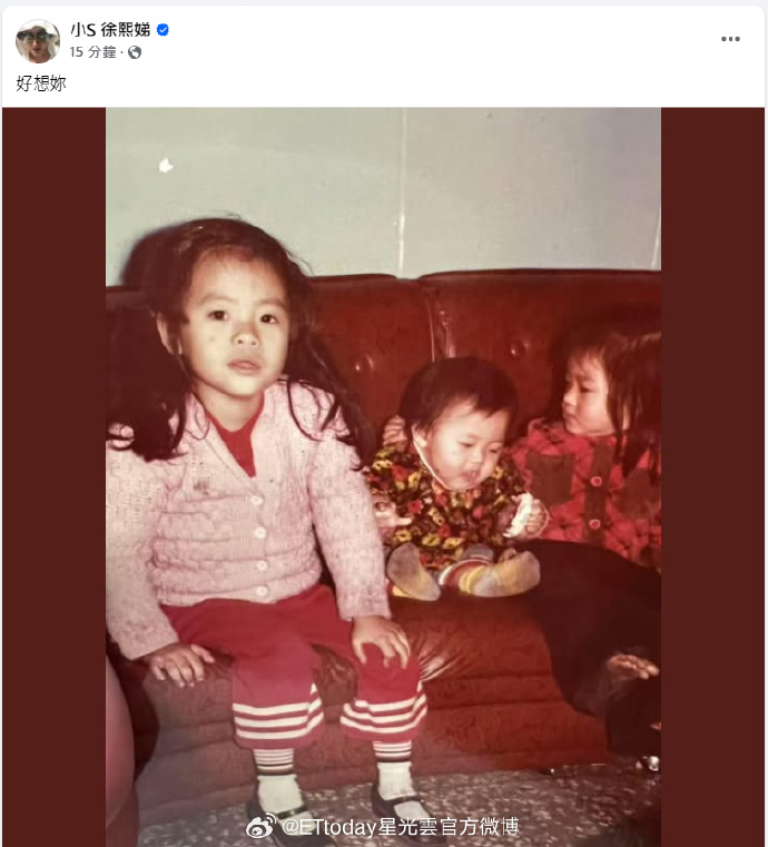 2月17日,据多家媒体报道,徐熙娣(小S)在社交平台晒出徐家三姐妹小时候的照片,并配文表示:“好想你。”