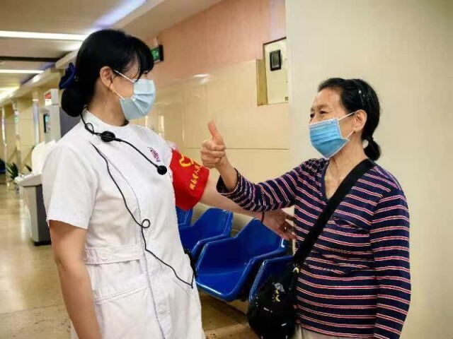 在“党员志愿服务岗”,穿着红马褂的志愿者们也时常为门诊老年患者提供移动式就诊志愿帮扶。医院还在挂号处设置“老年人就医优先通道”为老年患者提供挂号、缴费、采血、检查、预约等优先服务,以及为80岁以上老年人无条件加号等举措。