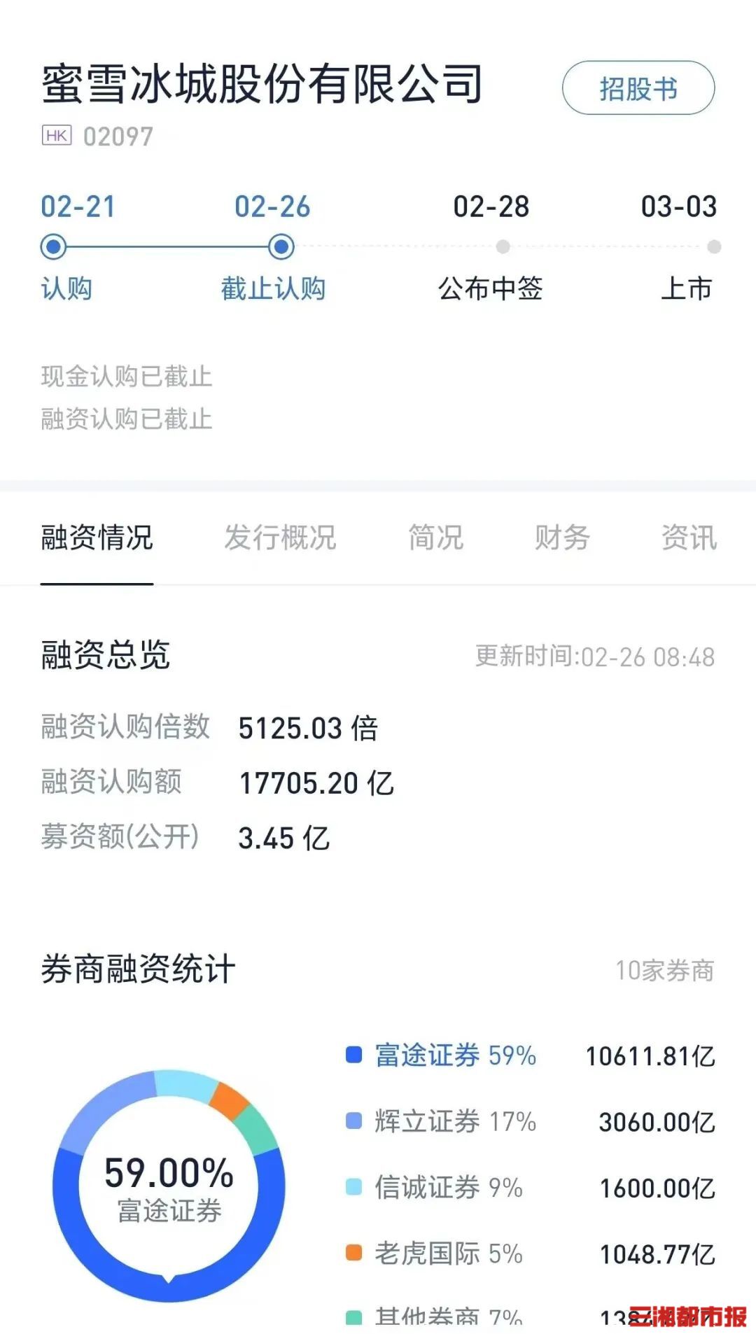 本次蜜雪集团港股IPO自2月21日开启申购以来,便受到市场的热捧,在券商杠杆式交易中,认购数据更是一路飙升。截至今天认购环节结束,融资认购最多的券商为富途证券,接近1.06万亿港元,占比达到59%,其次为辉立证券,达到3060亿港元,占比17%,信诚证券、老虎证券等也都超过千亿港元。