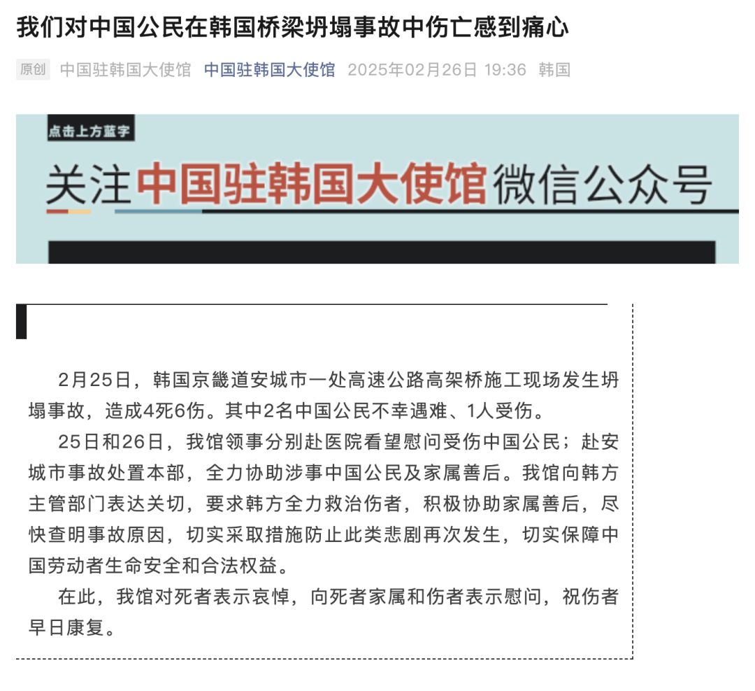 2月26日,中国驻韩国大使馆发布消息,对中国公民在韩国桥梁坍塌事故中伤亡感到痛心。