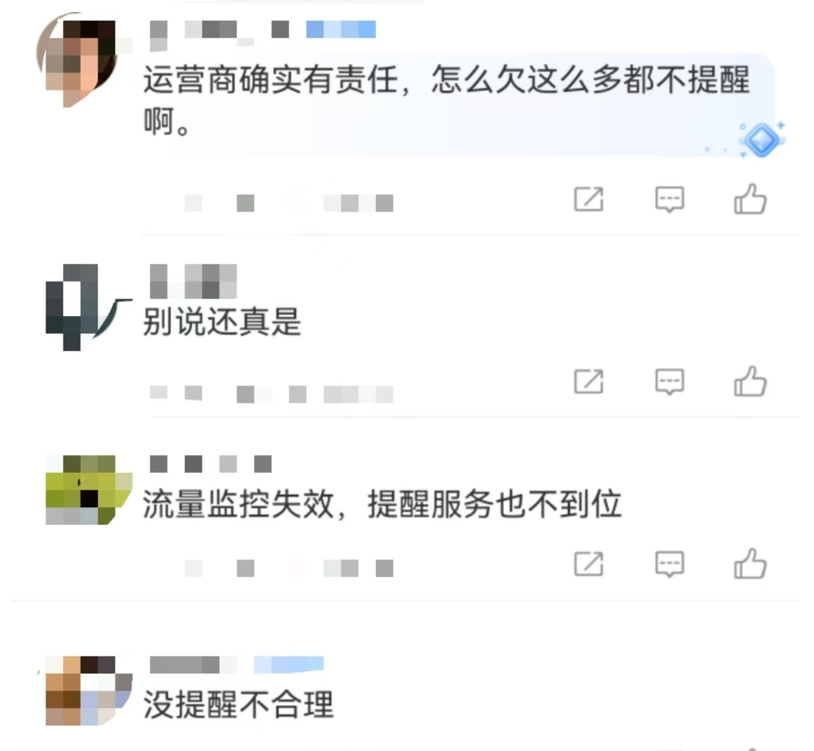 事件曝光后,“天价流量费”引发关注,相关微博话题阅读量破三千万。针对“天价流量费”,网友们观点不一:有网友指责运营商在流量监控和提醒方面存在失职,认为运营商应该在用户流量超出正常范围时及时提醒并采取措施以此阻止进一步消费;有网友对如此高的流量消费表示疑惑,怀疑是否存在不合理之处;还有一些声音认为,用户自身也应该检视自己的网络使用习惯,避免因失误造成不必要的损失。