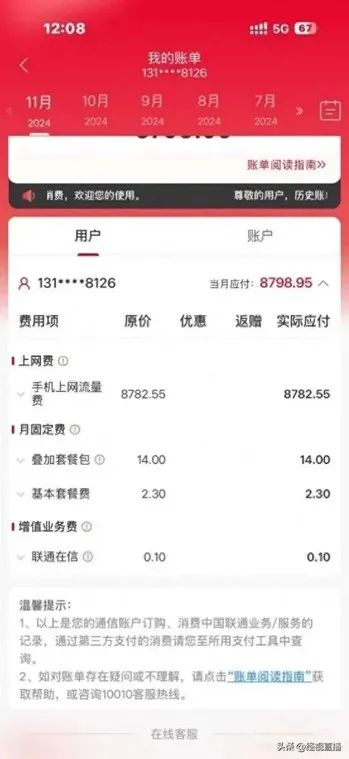 小陶向记者展示的一张欠费短信截图显示,2024年12月8日,10010向其发送短信称,手机上网费8783元,月固定费17元,合计8800元。其中,去年11月19日当天一笔400MB的套餐外计费流量,费用高达122.88元。