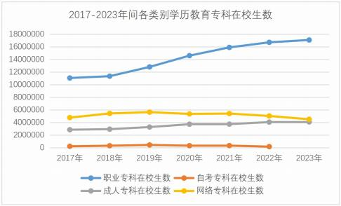 图 4 2017-2023 年间各类别学历教育专科在校生数