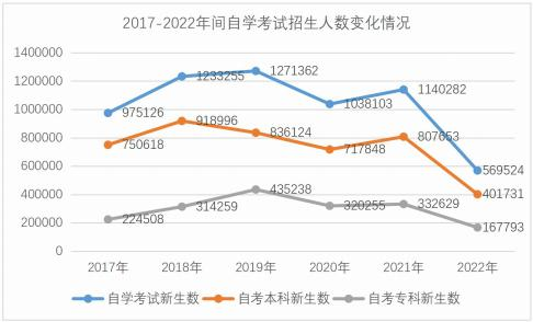 自学考试生源数锐减是自学考试面临的主要问题。根据教育部公布的全国各级自学考试基本情况数据显示,1983年首届自学考试招生人数为87154人,之后逐年增加。1996年招生人数首次破百万,达163.25万人。2001年招生人数达到顶峰,321.32万人。然而,从2003年开始,招生人数显著下降,降幅约为34.83%。随后十余年,保持下降趋势,2015 年跌至91.8万人。2017-2021年间(见图1),自学考试招生人数起伏较大,从2018招生数重回百万关口后,2022年招生数缺由前一年的114.03万下降至56.94万,跌幅超过50%。