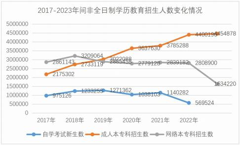 图 2 2017-2023 年间非全日制学历教育招生人数变化情况