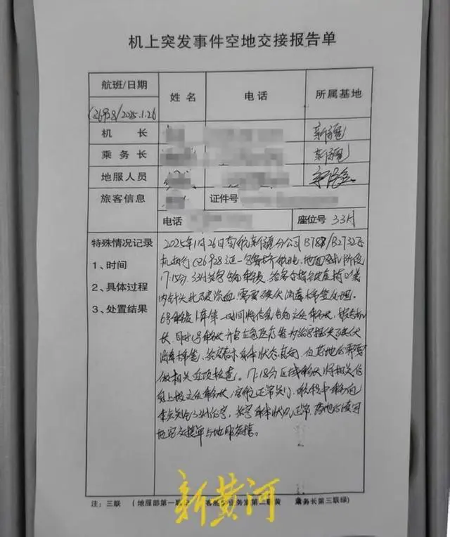 随后,乘务员提供了碘伏消毒棉签进行简单处理,并出具“机上突发事件空地交接报告单”。根据记录,乘客身体状况良好,但落地后需要做相关血液检查。落地后填写交接单(给)与地服交管。
