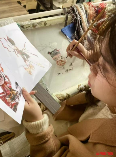 “哪吒小夜灯一共有两层,前面一层是刺绣,后面一层用的是图画。”雅秀集湘绣艺术馆主理人蒲宇凤一边向记者介绍自己用时一周绣制的作品,一边轻抚绣面上跃动的“三昧真火”,“我们通过数字化设计优化图案细节,采用专利装裱技术,通过后面一层影射前景,让小夜灯在夜间呈现立体动态效果,十分受年轻人的喜欢”。