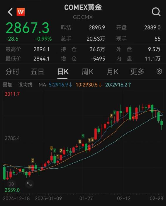 当地时间2月28日收盘,COMEX黄金报2867.3美元/盎司,本周累计跌幅达2.91%。