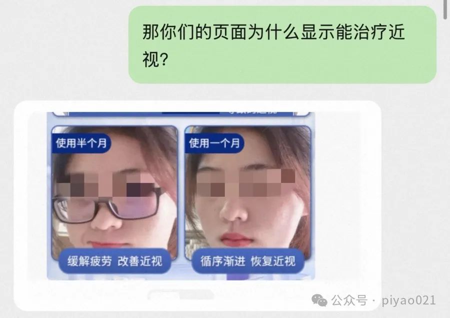 可当记者询问为啥页面宣传能治疗近视时,客服又发来一张“使用半个月,缓解疲劳,改善近视;使用一个月,循序渐进,恢复近视”的图片。