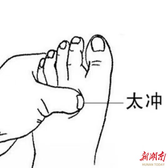 太冲穴:位于足背第一、二跖骨结合部之前的凹陷中,称为“消气穴”。每天用拇指指腹按揉太冲穴3~5分钟,可起到疏肝理气、平肝泻火的作用,力度以有酸、胀、痛感为宜。
