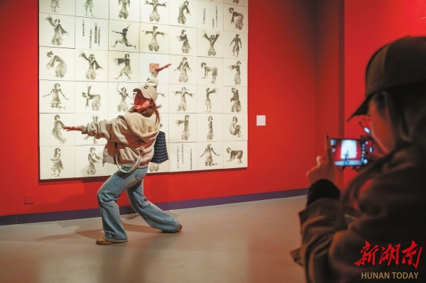 观众模仿作品中的人物动作拍照打卡。 湖南日报全媒体记者 辜鹏博 摄