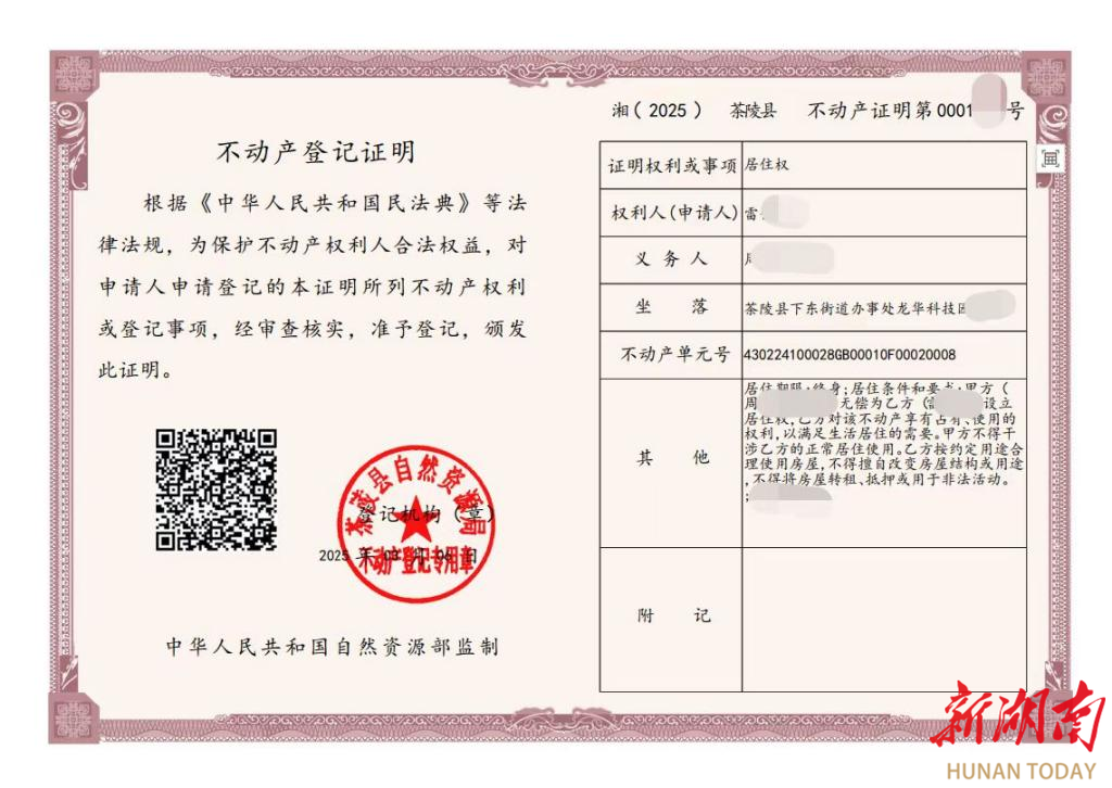 湖南日报·新湖南客户端3月21日讯(通讯员 陈艳平)3月21日,茶陵县自然资源局不动产登记中心为雷女士颁发了居住权登记证明,这是该县颁发的第一本居住权登记证明,标志着茶陵县居住权登记业务全面启动。