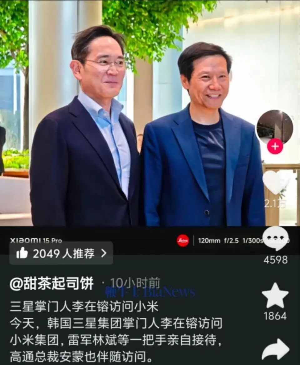 3月22日,有网友爆料三星电子会长李在镕、高通公司总裁安蒙访问小米汽车工厂,由雷军、林斌等高层接见,并放出人员合照。