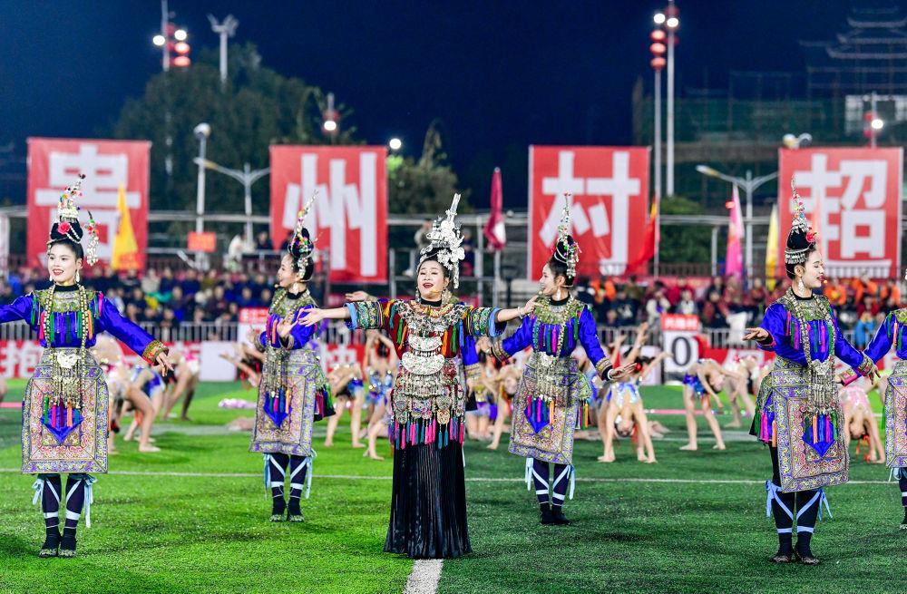 △2025年3月14日,2025年贵州“村超”40强交叉赛在榕江“村超”足球场举行,演员在比赛间隙表演侗族大歌。