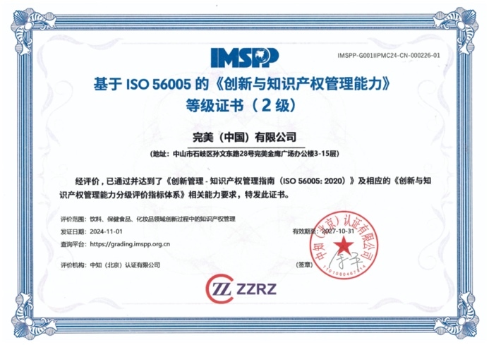 作为技术驱动的健康美丽企业,完美公司深知知识产权的战略价值。2024年,完美公司顺利通过ISO 56005创新与知识产权管理能力二级评价,系其首次获得知识产权国际标准体系认证。在引入ISO 56005创新与知识产权管理体系后,完美公司按照标准要求将创新与知识产权管理深度融合,将知识产权作为工具嵌入创新全过程,为企业发展构筑起“护城河”,更为消费者放心消费保驾护航。从数量上来看,完美公司累计获得的相关认可和荣誉已超过40项,并先后被国家知识产权局评为国家知识产权优势企业、示范企业。