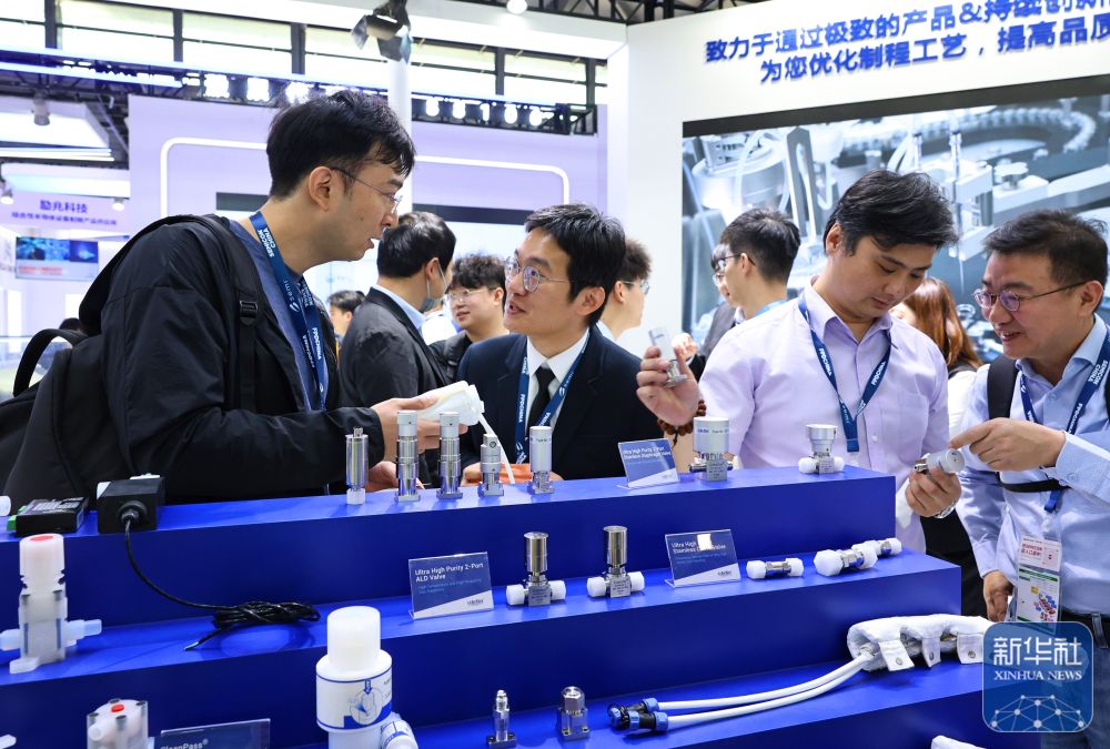 3月26日,参观者在一组集成电路制造设备阀门零部件展品前交流讨论。