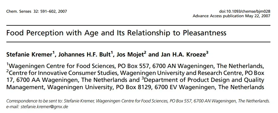 2007年《化学感应》期刊上的一项研究就指出:相比年轻人,老年人对于食物味道、食物质地、味道刺激浓度的感知都更低。换句话说,酸甜苦辣咸,老年人都需要更高的浓度,才能体会到和年轻人一样的感觉。