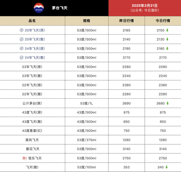 今日酒价披露的批发参考价显示,3月31日,25年飞天茅台原箱较前一日下跌15元,报2150元/瓶;25年飞天茅台散瓶较前一日下跌10元,报2130元/瓶。24年飞天茅台原箱较前一日下跌10元,报2180元/瓶。