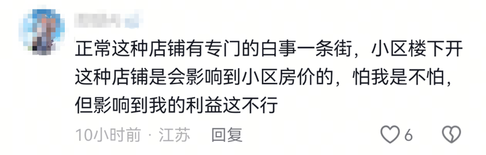 有居民表示,该丧葬店处于小区出入口必经之路,对住户的生活造成很大困扰,孩子经过都觉得害怕。还有居民认为,小区地处城市主干道,丧葬服务店会影响城市形象。店主则认为自己是通过正规手续开店,营业执照等一应俱全,理应正常经营。