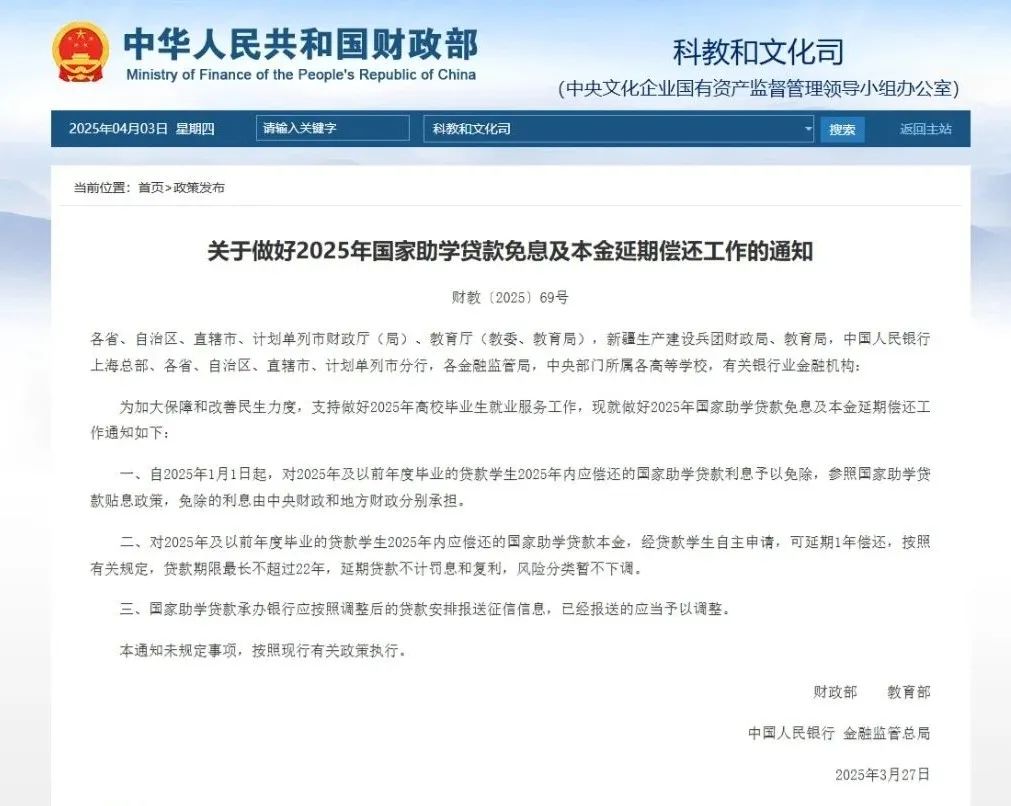 财政部、教育部、中国人民银行、国家金融监管总局日前发布通知称,决定2025年延续实施国家助学贷款免息及本金延期偿还政策。 通知明确,自2025年1月1日起,对2025年及以前年度毕业的贷款学生2025年内应偿还的国家助学贷款利息予以免除,参照国家助学贷款贴息政策,免除的利息由中央财政和地方财政分别承担。对2025年及以前年度毕业的贷款学生2025年内应偿还的国家助学贷款本金,经贷款学生自主申请,可延期1年偿还,按照有关规定,贷款期限最长不超过22年,延期贷款不计罚息和复利,风险分类暂不下调。据悉,本次措施的出台,预计减免利息约24.8亿元,惠及约600万名高校毕业生,有助于缓解贷款学生经济压力和就业压力,帮助学生维护个人信用记录,促进其顺利就业。国家助学贷款免息及本金延期偿还政策作为一项阶段性政策,自2022年起已经连续实施4年。财政部表示,2025年将对该政策进行全面评估,结合评估情况研判2026年及以后年度是否延续实施。责编:周阳乐