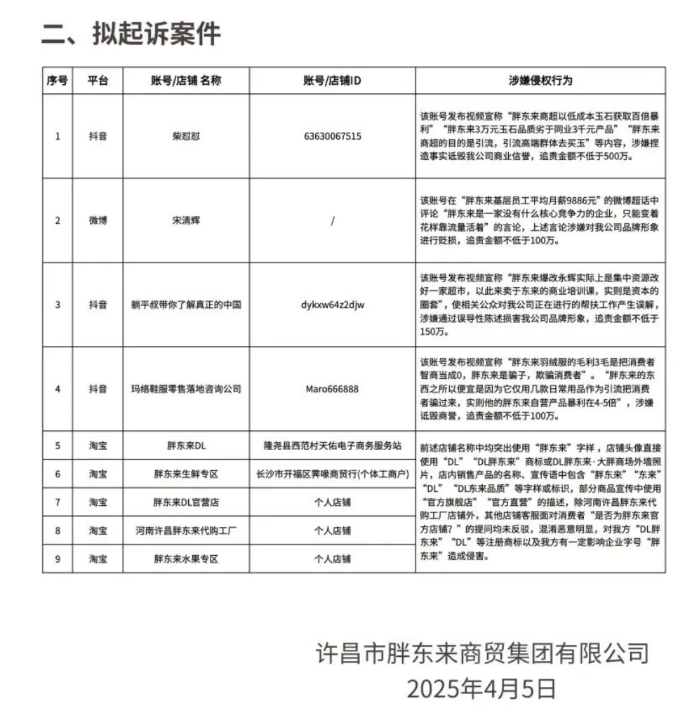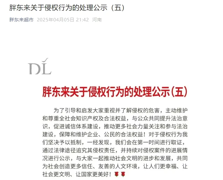4月5日晚,胖东来商贸集团有限公司发布《胖东来关于侵权行为的处理公示(五)》。