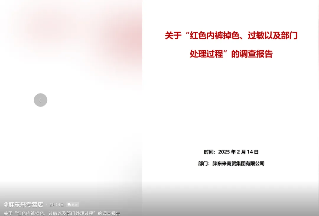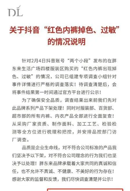 回溯该事件,2月4日,网红“两个小段”在抖音发布视频,称从胖东来购买的红内裤掉色,使用后出现过敏反应,还表示胖东来工作人员处理方式不当。胖东来当日迅速回应,组建专项调查小组并下架涉事品牌系列产品。2月6日,胖东来再次发文,承认管理存在问题并致歉,承诺公示调查结果。