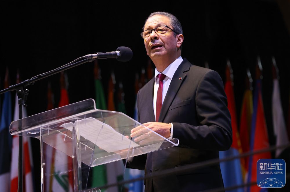 ↑国际中学生体育联合会代理主席优素福·贝尔卡斯米在开幕式上致辞。