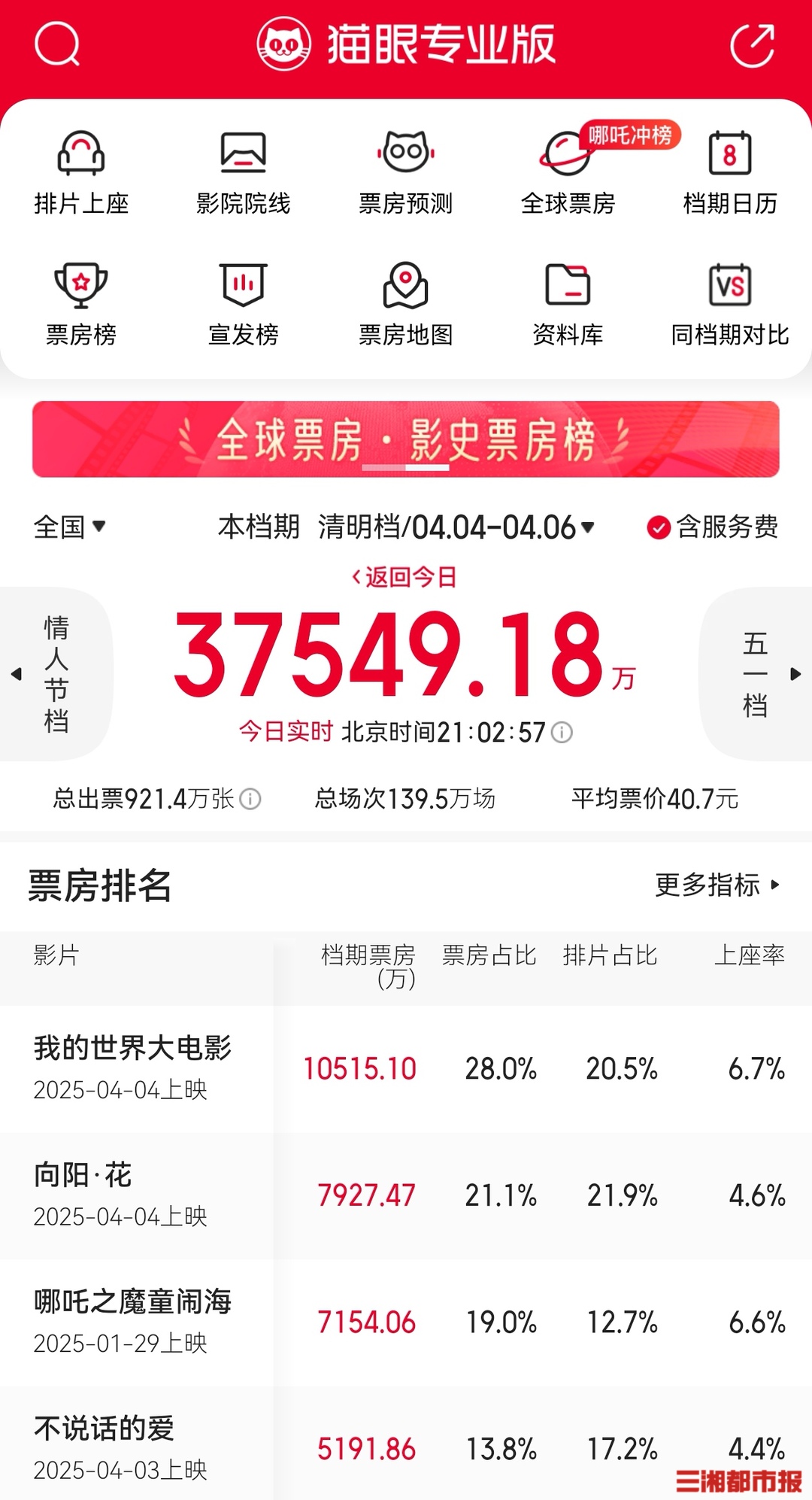 三湘都市报4月6日讯(全媒体记者 罗艾敏整理)据猫眼专业版数据,截至4月6日21时,2025年清明档档期(4月4日—4月6日)票房达3.7亿元,创近十年最低。其中,清明档新片票房3.1亿元,《我的世界大电影》票房超1亿元;《向阳·花》《不说话的爱》分列第二、三名,票房均超7000万元。