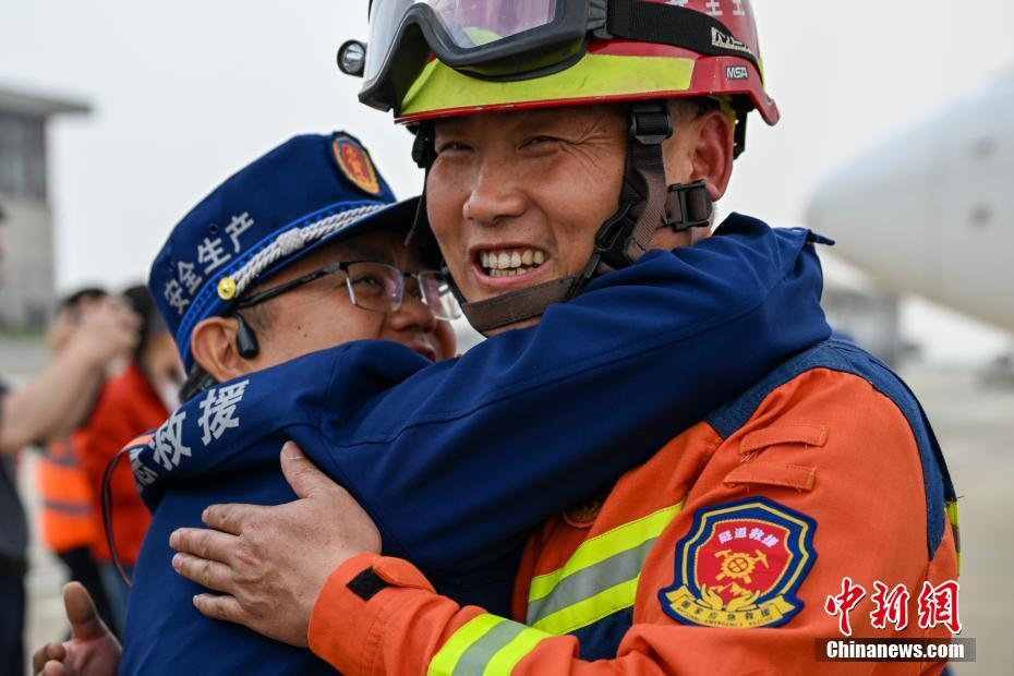 4月6日,中国云南救援医疗队完成在缅甸的地震救援任务,乘坐飞机顺利返回云南昆明。同机抵达昆明的还有十多名中国红十字国际救援队人员。据了解,3月28日,缅甸发生强震。次日,共37人的中国云南救援医疗队,携带全功能生命探测仪、地震预警系统、便携式卫星电话、无人机等救援物资,从昆明飞抵仰光,驱车赶赴缅甸震区。图为云南救援医疗队队员与战友拥抱。中新社记者李嘉娴摄