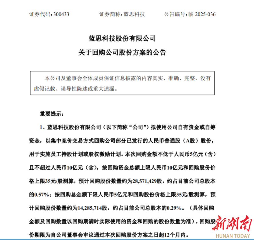 公告显示,蓝思科技于2025年4月7日召开临时董事会,基于对公司未来发展前景的信心和对公司价值的认可,为维护广大投资者合法权益,增强投资者信心,进一步完善公司长效激励机制,激发关键管理人员、技术及业务骨干等人才的工作热情,促进公司长期健康发展,公司拟使用自有资金或自筹资金,以集中竞价方式回购公司股份5-10亿元,回购价格上限为35元/股,并在未来适宜时机用于股权激励计划或员工持股计划。
