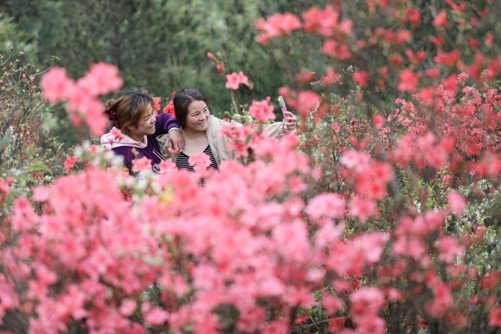 ↑ 4月8日,游人在湖南省永州市道县宜山岭野生杜鹃花丛里赏花拍照。新华社发(何红福摄)