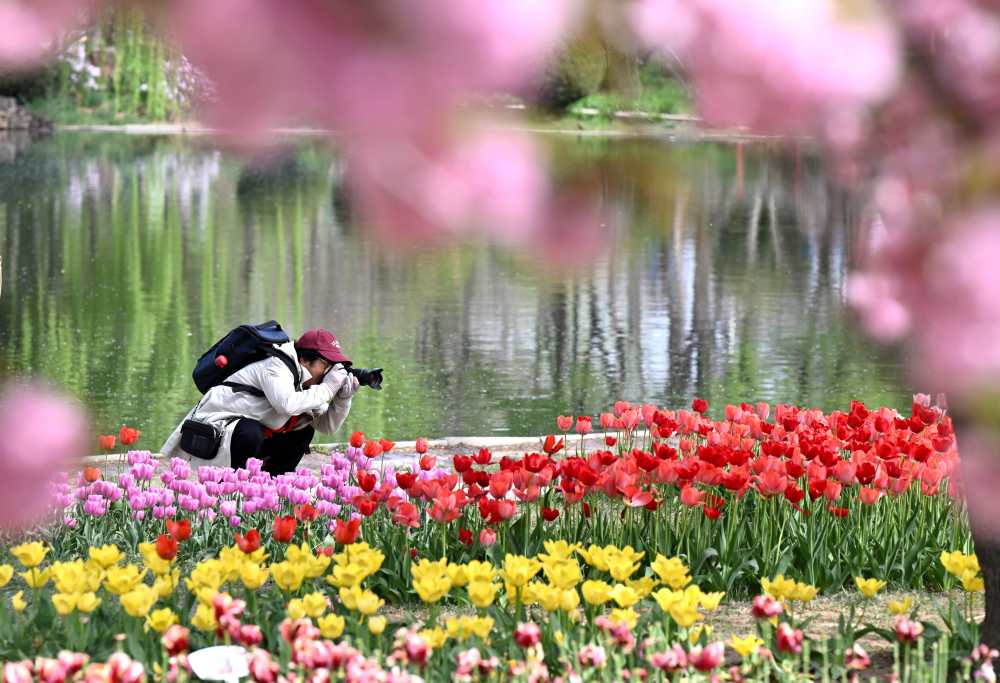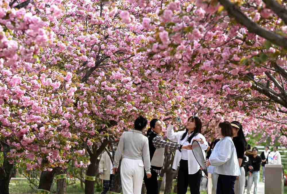 ↑ 4月8日,游客在河北省石家庄市植物园赏花游玩。新华社发(陈其保摄)