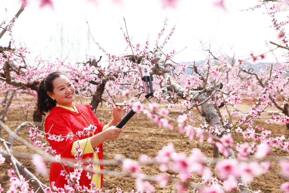 ↑ 4月8日,游客在河北省唐山市丰润区左家坞镇北夏庄村桃园拍照留念。新华社发(朱大勇摄)