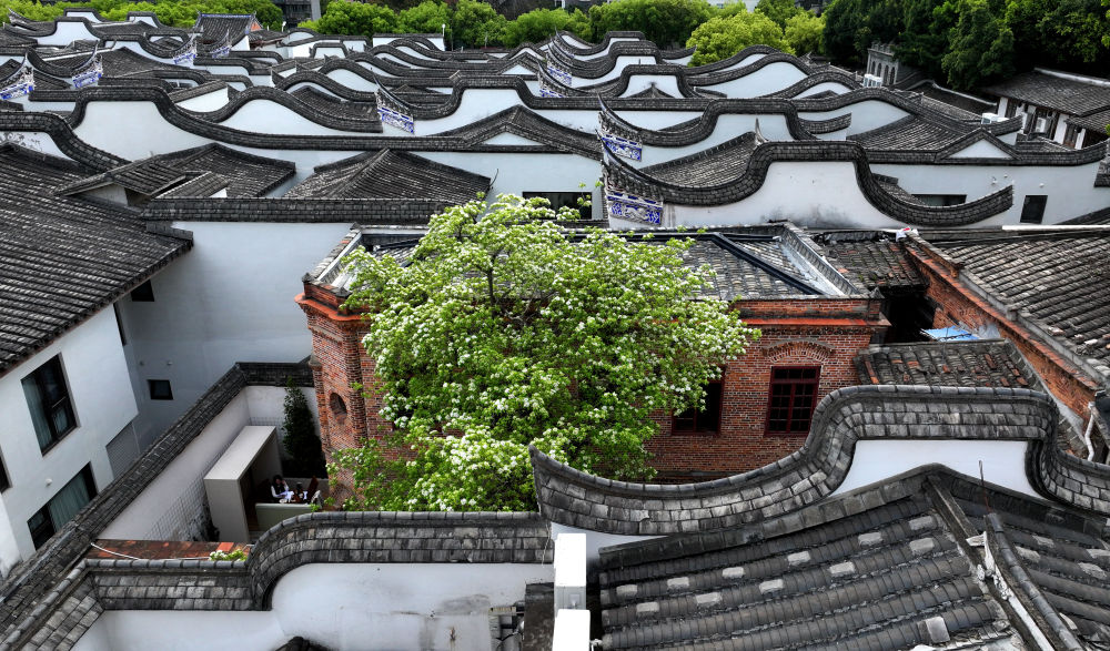 ↑ 4月7日在福建福州三坊七巷衣锦坊拍摄的流苏花(无人机照片)。新华社发(王旺旺摄)