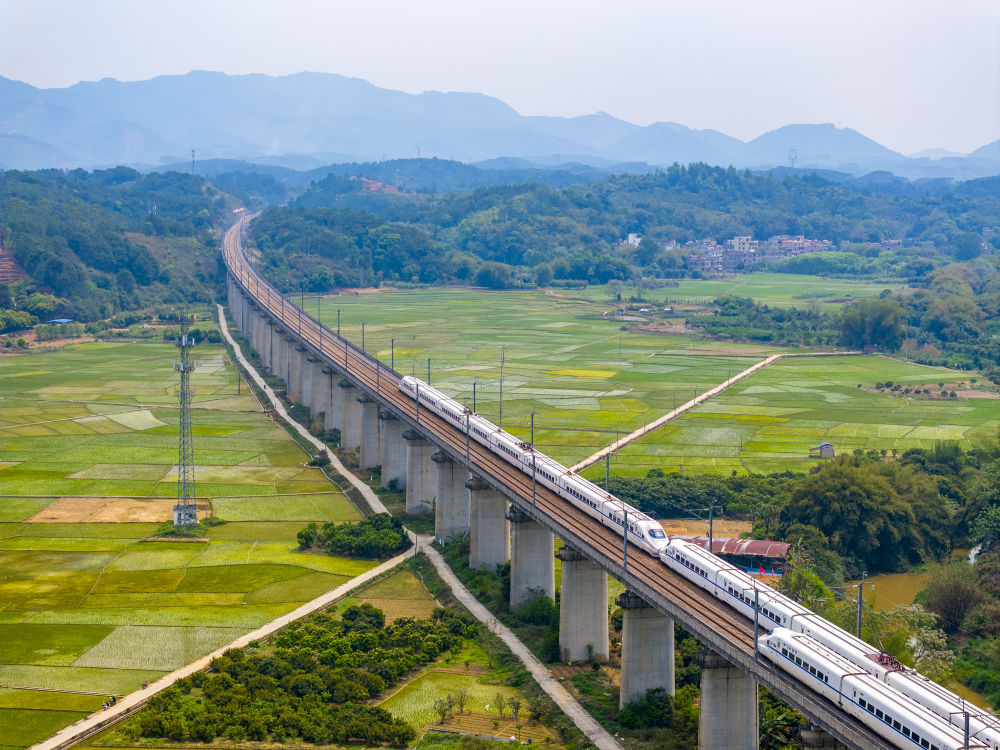 ↑ 4月8日,动车组在广西梧州市龙圩区龙圩镇念村境内行驶(无人机照片)。新华社发(何华文摄)