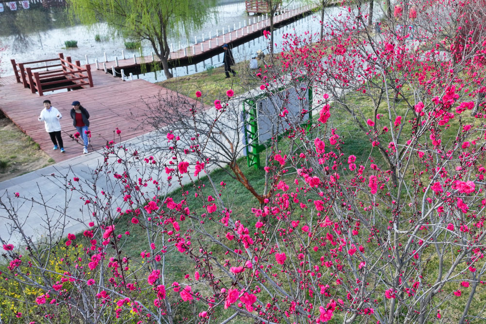 ↑ 4月8日,市民在河北省唐山市丰南区人民公园赏景游玩(无人机照片)。新华社发(李秀清摄)