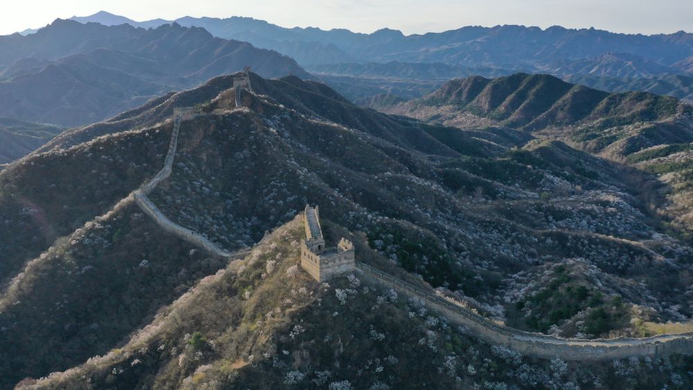 ↑ 这是4月8日在河北省承德市滦平县拍摄的金山岭长城春色(无人机照片)。新华社发(周万平摄)