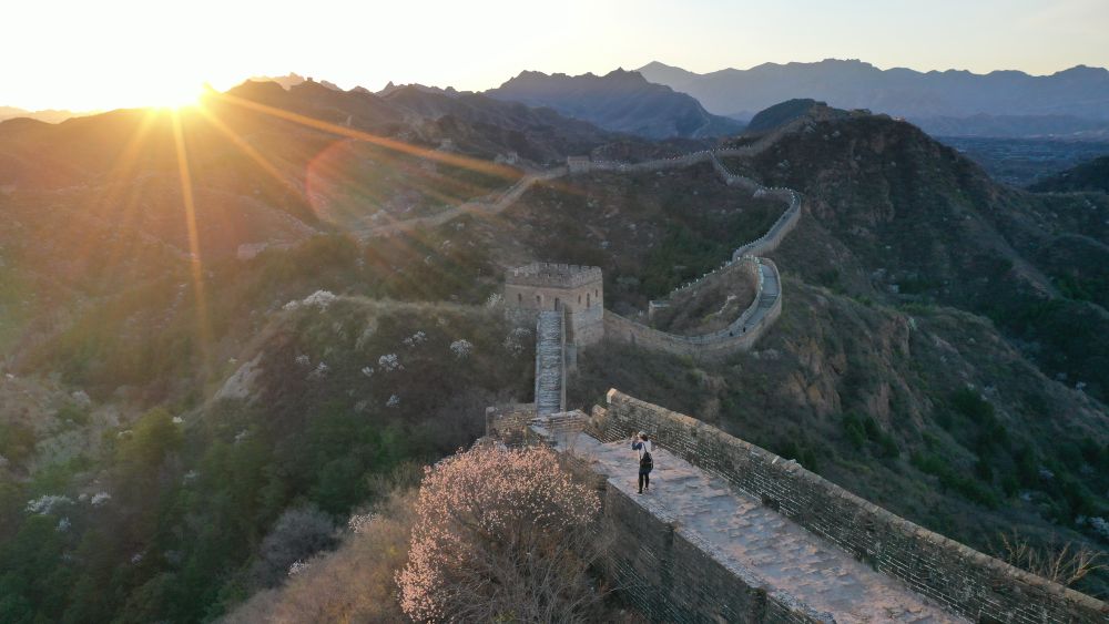 ↑ 4月8日,游客在河北省承德市滦平县金山岭长城踏青赏花(无人机照片)。新华社发(周万平摄)