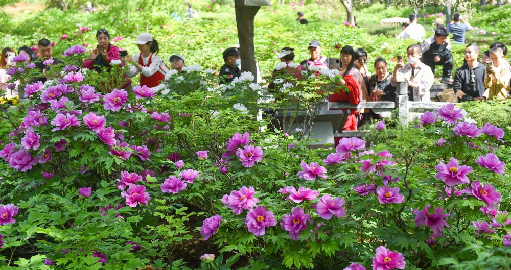↑ 4月8日,游客在山东省滕州市荆河公园的牡丹园内赏花拍照。新华社发(李志军摄)