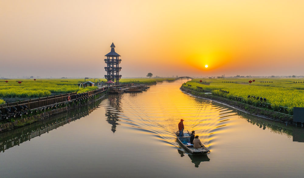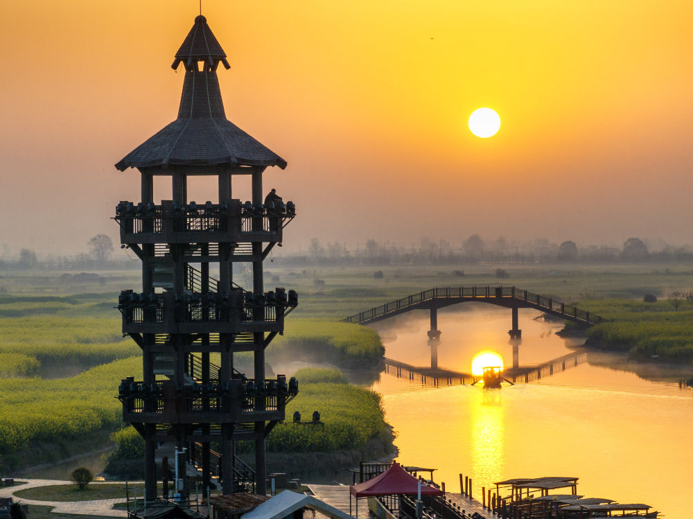 ↑ 4月8日拍摄的江苏省兴化市千垛景区日出晨景(无人机照片)。新华社发(周社根摄)